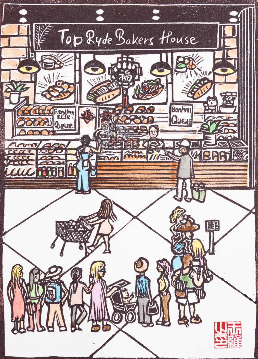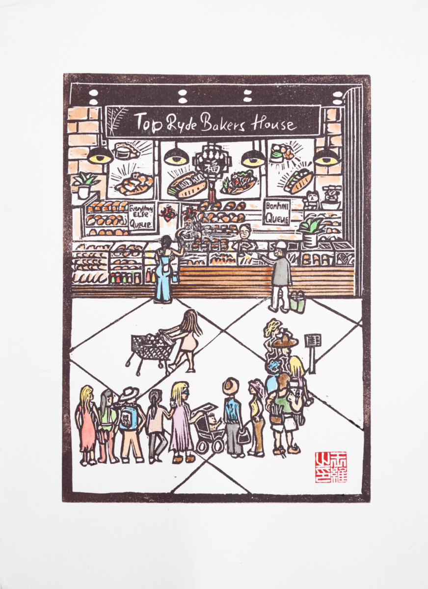 Top Ryde Bakers House Original Linocut Print with oil-based ink and hand colouring on 300 gsm wood pulp printmaking paper.