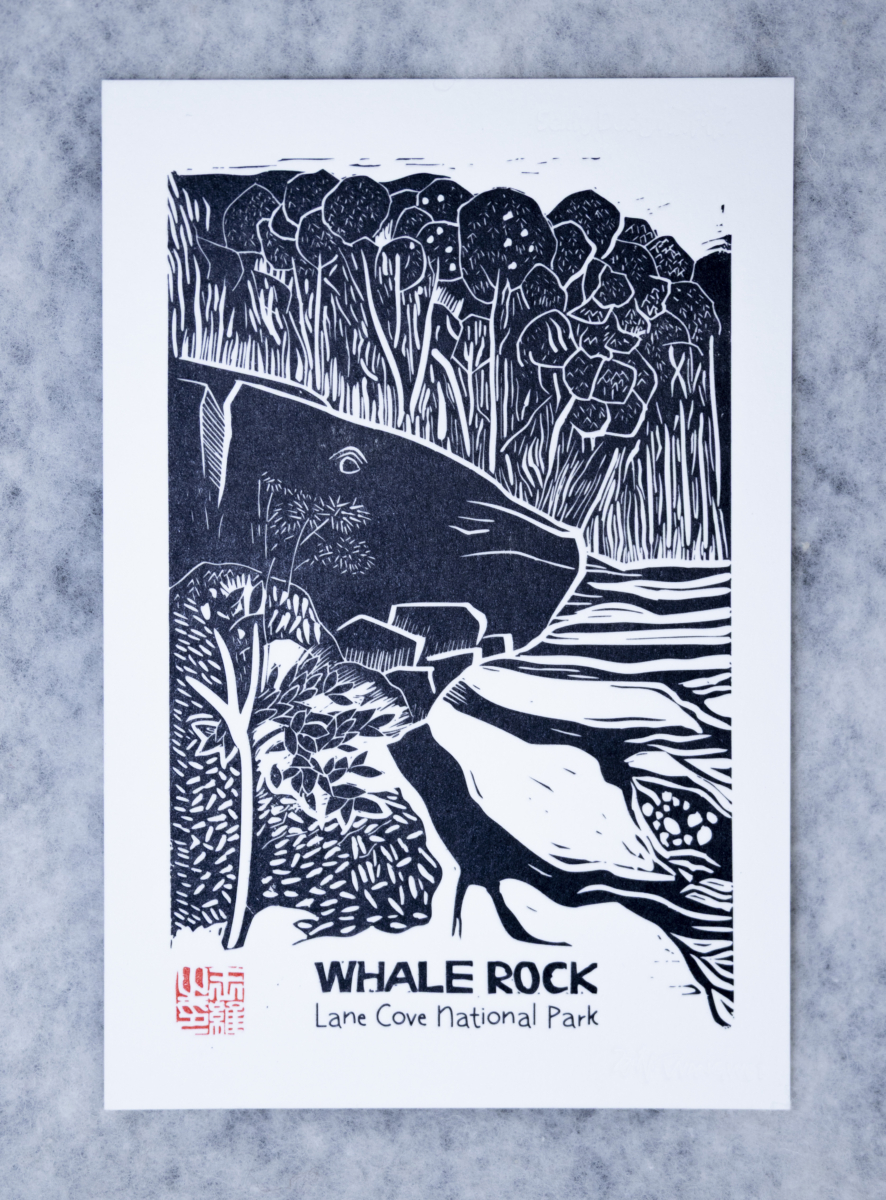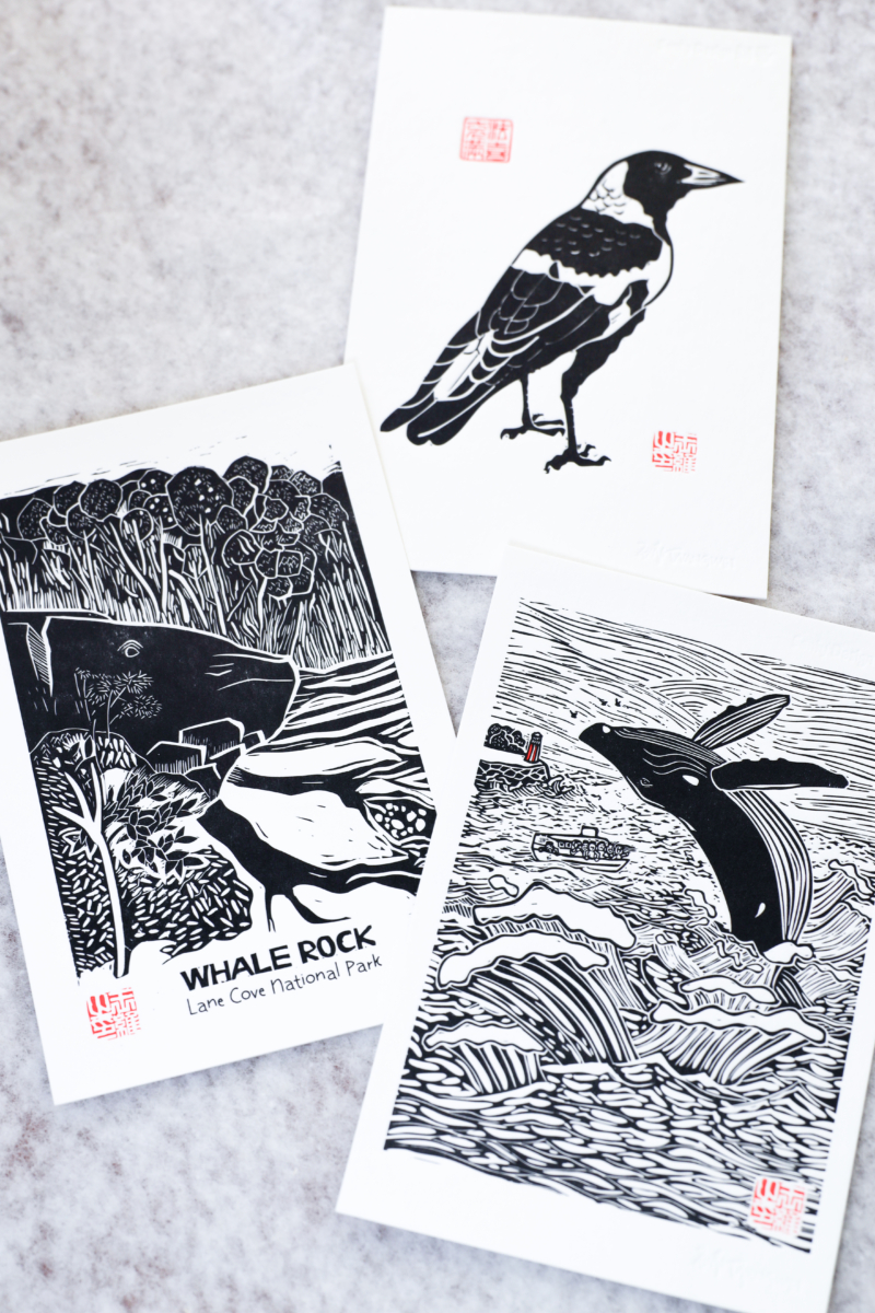 This embossed card is professionally crafted by a partner fine art print studio, using my original linocut designs as the basis. Each motif—such as Whale Rock, Baby Magpie, or Whale Watching—is reproduced through high-quality embossing on luxurious 600gsm premium paper.