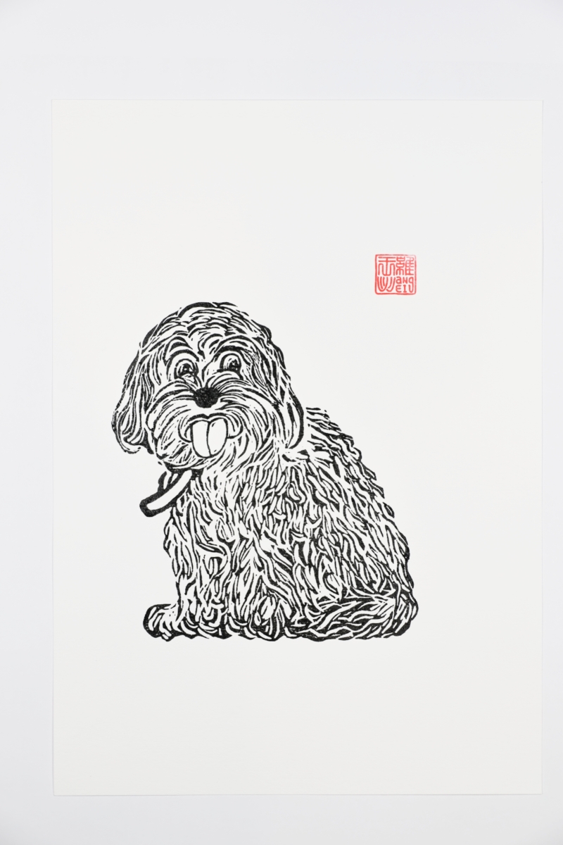 Cheerful Cavoodle linocut print from the Furry Friends series — hand-carved, hand-printed, full of playful charm.