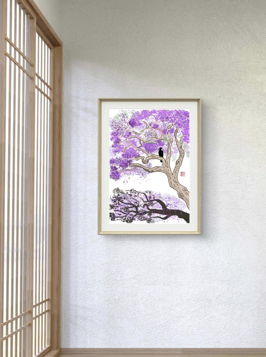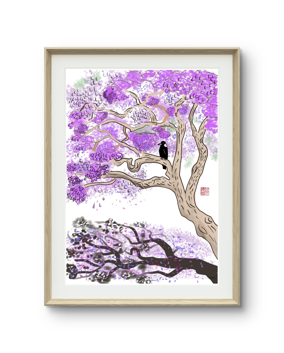 Magpie on Jacaranda | Digital Painting by Wang Wei A digital artwork featuring a magpie perched among jacaranda blooms. For personal, non-commercial use only. Not permitted for commercial purposes. This is a high-resolution digital image available as an instant download. Your purchase includes a ZIP file. After downloading, simply unzip it to access the high-res…