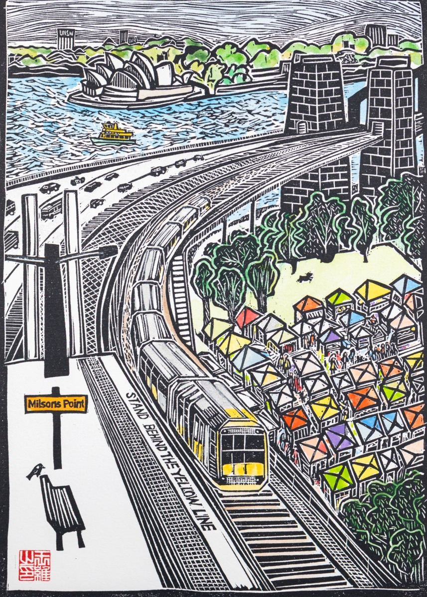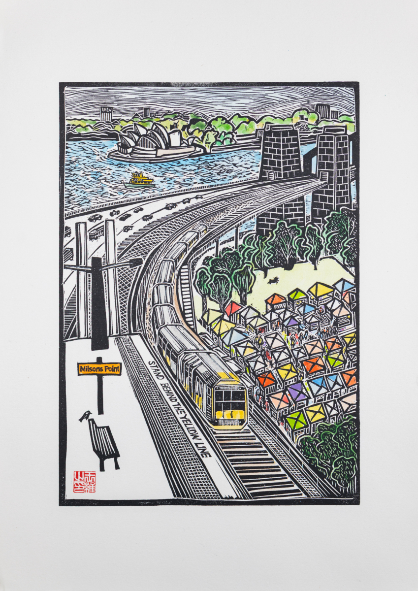 Printed with colour oil-based ink and hand-coloured with water colours on 300gsm wood pulp printmaking paper.